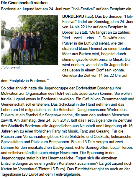 Open-Air in Bordenau - Mehr Pep ins DorfDorfjugend plant Holi-Festival am 24. Juni / Farbenfestival soll ländliche Jugendkultur erneuern![]() |